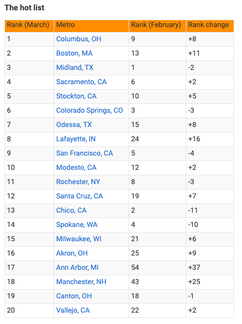 The state capital, Columbus, came in at No. 1 on the list, which reflects a combination of how fast homes take to sell (days on market) and the number of listing views racked up in each market. Both of these are an indicator of buyer demand. Akron and Canton came in at No. 16 and No. 19 respectively. Meanwhile, Cleveland and Cincinnati were the large metros with the most year-over-year improvement. That's a big change from the days (last year, even!) when the list was regularly topped by pricey California markets such as San Francisco and San Jose. (Each metropolitan area may also include smaller satellite cities.)