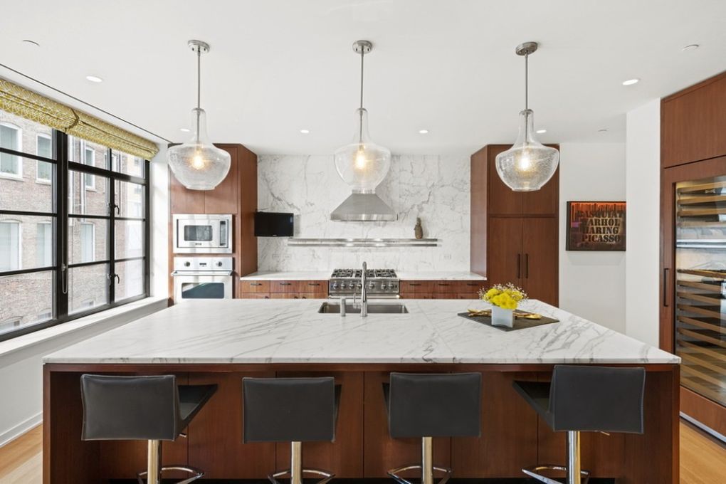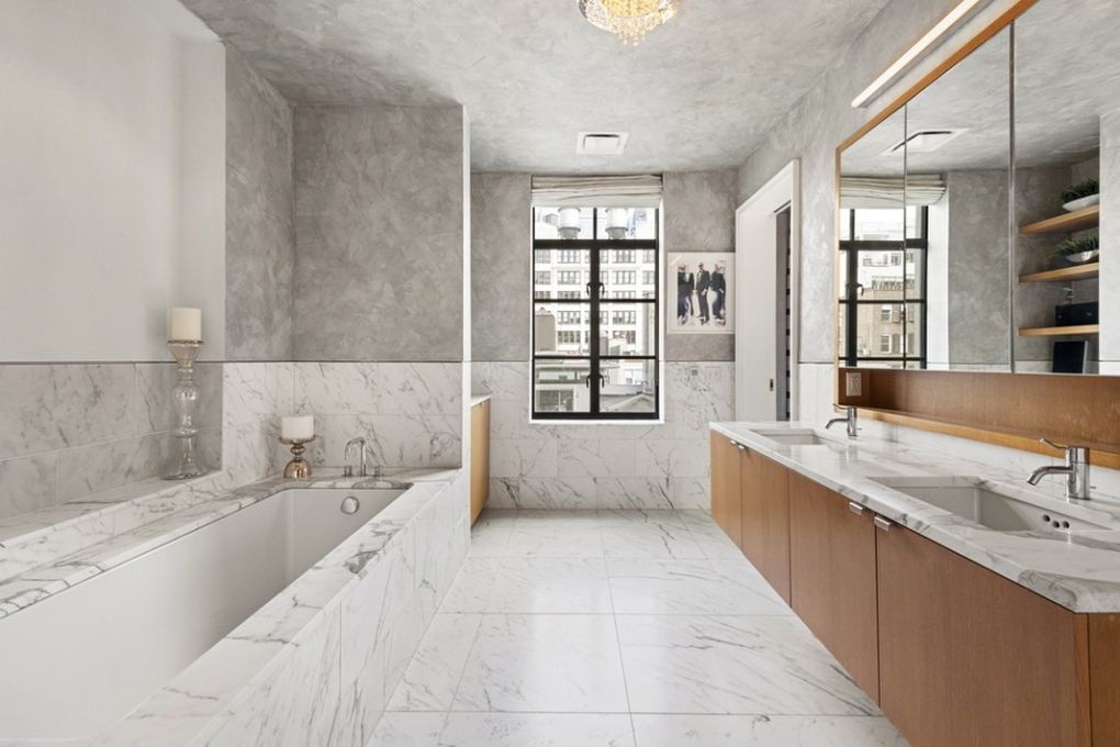 The five-bedroom loft has two separate entertaining rooms, a dining area, an open kitchen that features a marble countertop and backsplash, as well as, a walnut cabinetry.