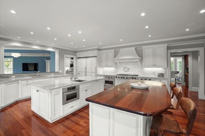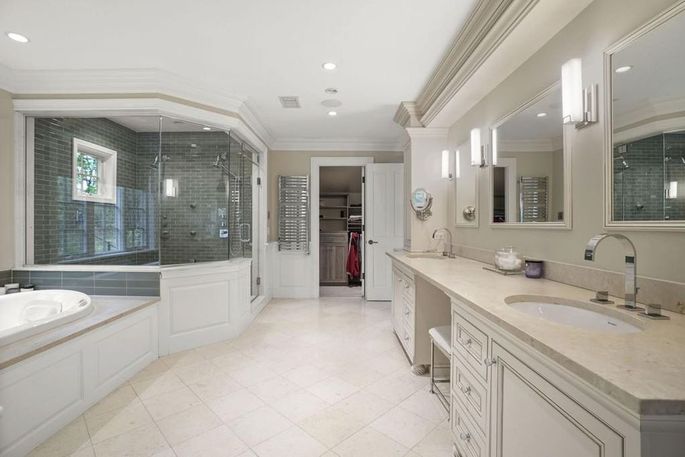 The 12,000 sq. ft., seven-bed home pulls you in from the jump. A grand entrance framing French doors opens up to a large foyer with dramatic double stairs. It has high ceilings and hardwood floors throughout the house, a spacious living room with an elegant fireplace, and a unique library that doubles well as an office. What a background for all these zoom calls.