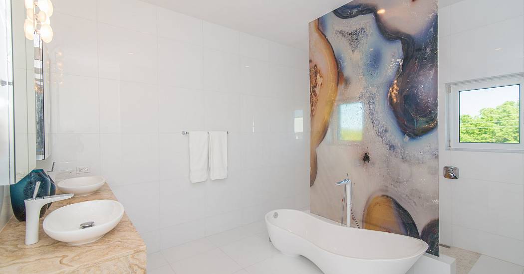 The estate includes four bedrooms and four and a half bathrooms and can sleep a maximum of 15 guests. The property features a master suite with its own private balcony with a fully fitted walk-in wardrobe, a second suite with a nook and balcony, and a den, which could double as a nursery. The master suite bathroom holds customized Hansgrohe hardware and a Victoria & Albert stand-alone bath. The vast third and fourth bedrooms are directly connected to the baths, as well.