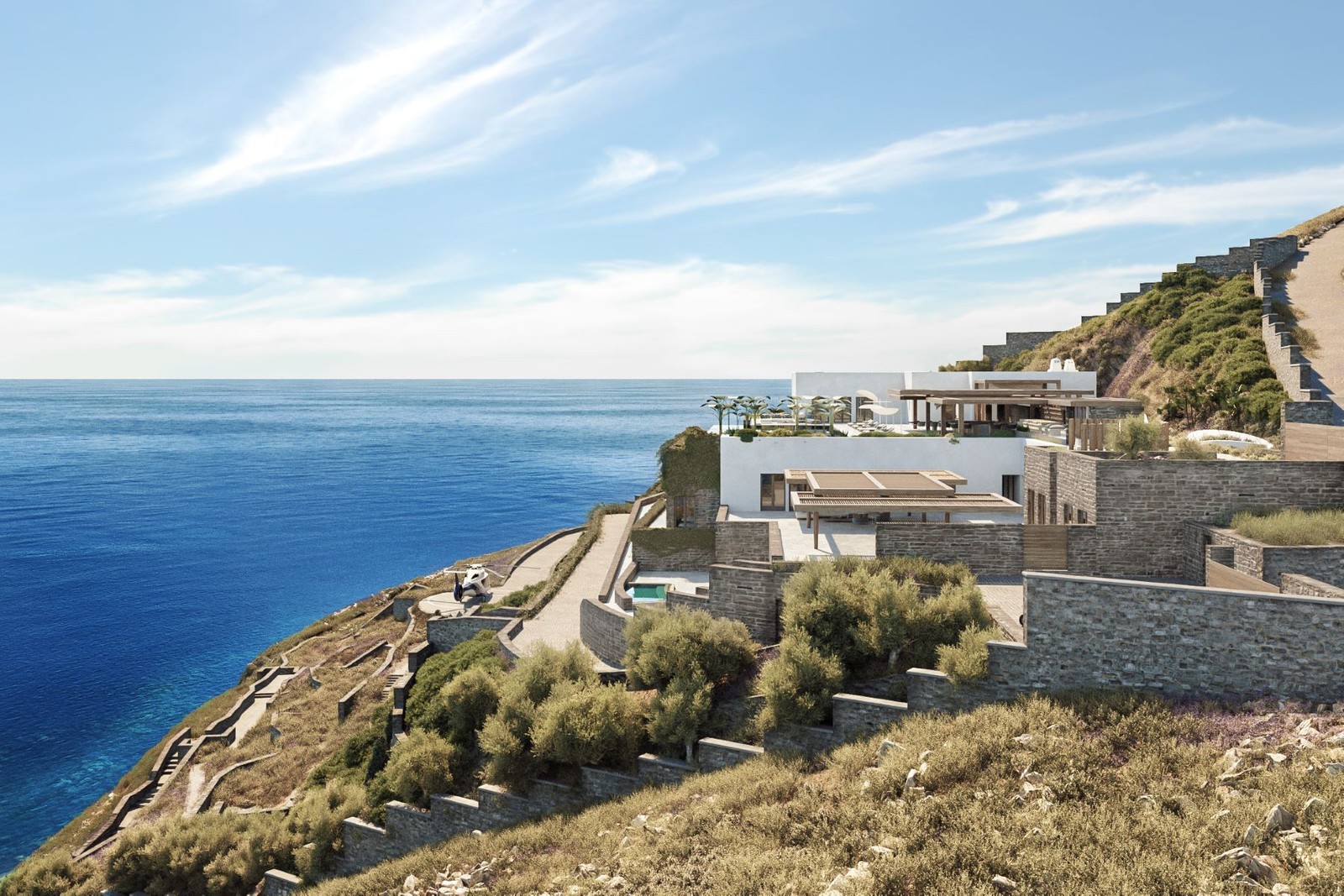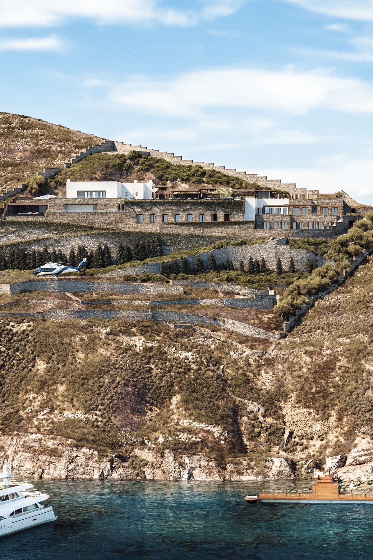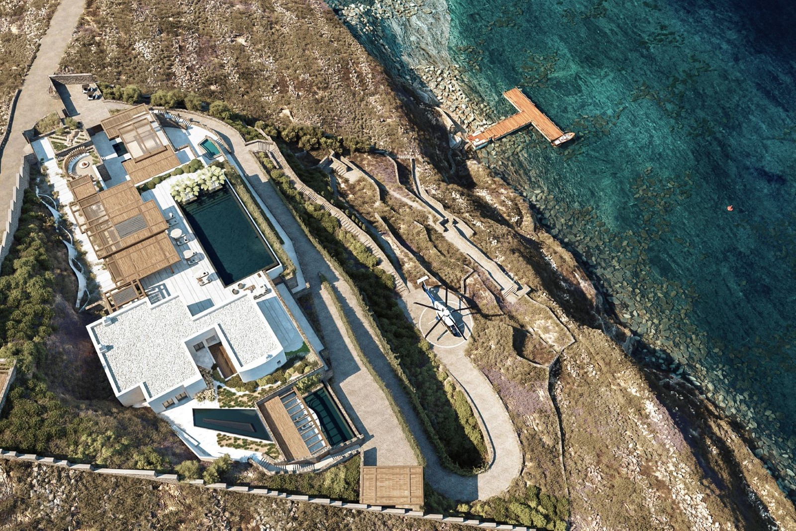 Easy access is provided whether arriving by sea, air, or land. There are stairs coming up from the shore, and even a helipad! It has its own private dock: Nammos, Skorpios, Santa Marina, and Ornos beach are only a 2-minute boat ride away.