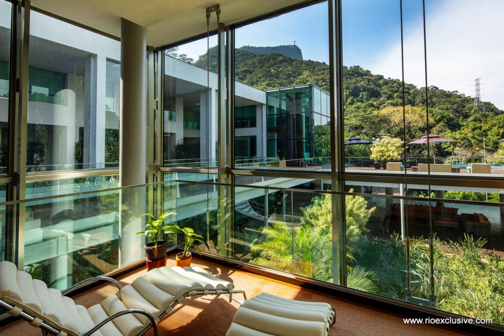 Outside, you can enjoy the natural wildlife of one of the most extensive urban forests in the world. There are multiple lakes with waterfalls surrounded by lush woods, a large infinity pool, and beautifully landscaped gardens. On the top floor, a beautiful deck allows for stunning vistas overlooking the Rodrigo de Freitas Lagoon towards Ipanema and the sea.
