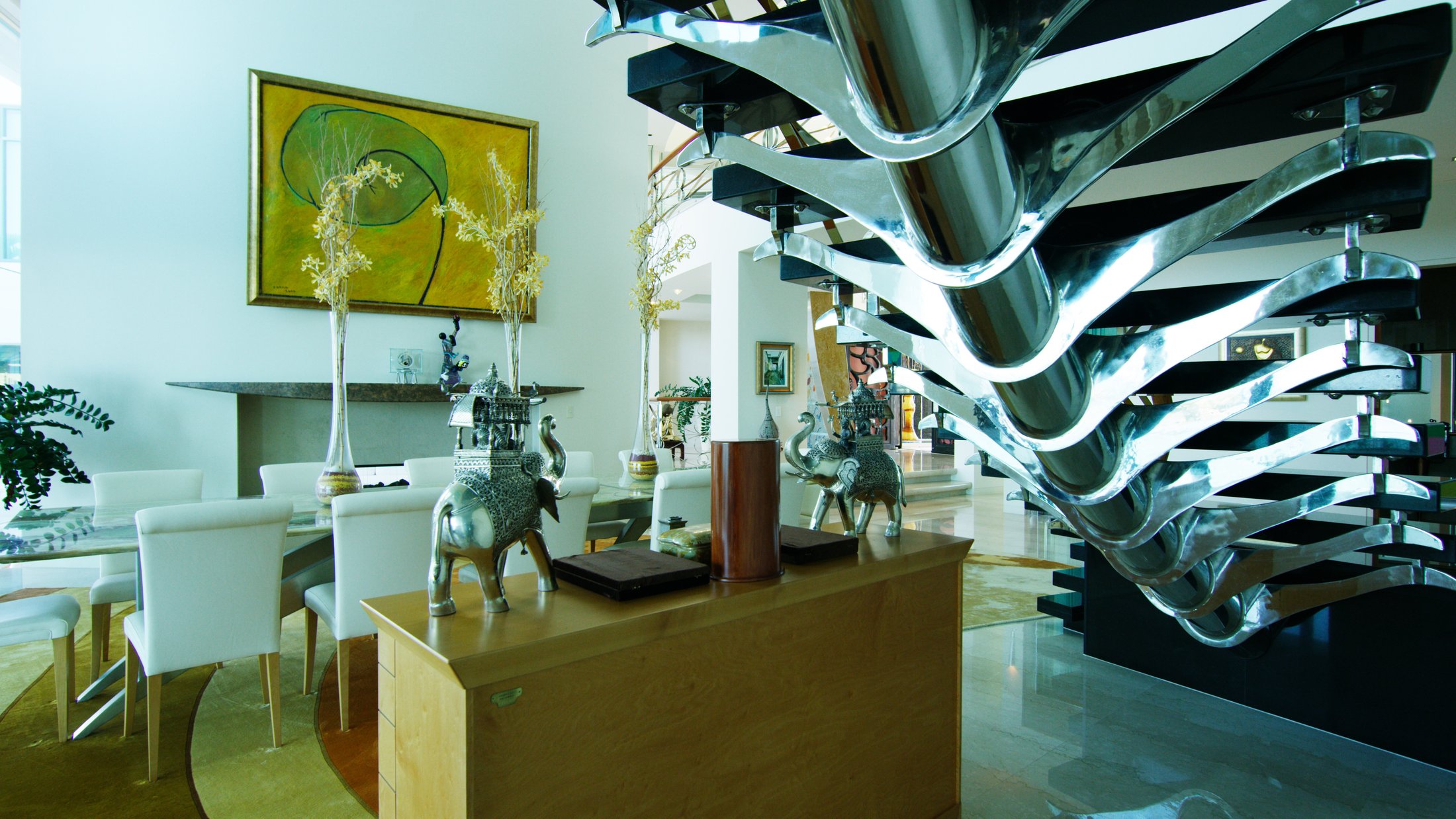 The stunning nautical-themed estate features 85m of waterfront land and incomparable southern views of the sea and the skyline. The 33045 sq. ft. lot took over three years to complete and highlights intricate custom details and open-plan spaces. A circular driveway with a fountain encompasses the house. It leads to a dramatic entrance with coral-inspired doors that cost $400,000!