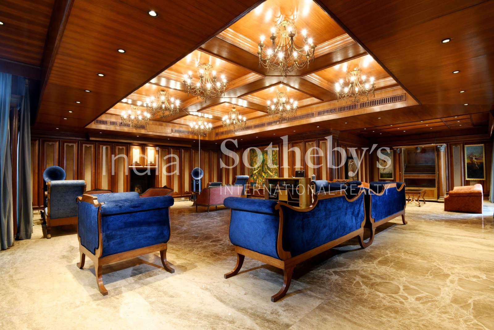 The luxurious interior boasts high-quality marble floors and arched ceilings. There's a stained glass ceiling through which natural light floods multiple rooms throughout the house. Furthermore, a balcony looks out into the beautifully landscaped garden and terrace.