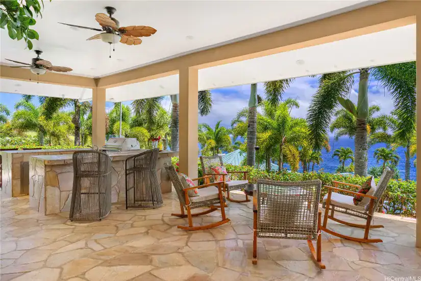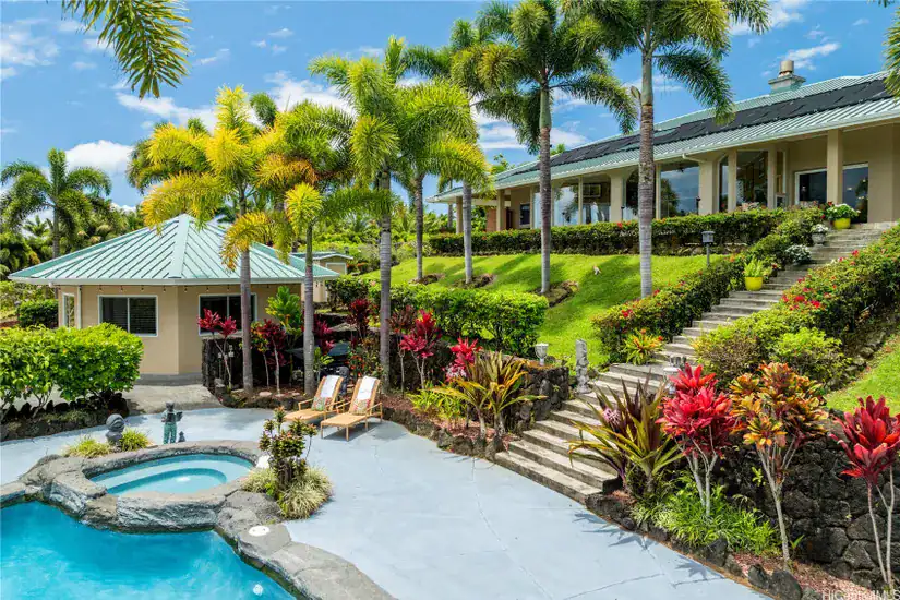 Three separate guest houses, each with a kitchenette and bathroom, are ideal for hosting visitors, private retreats, or as luxury vacation rentals. Resort-style amenities feature a renovated pool with waterfall, a spa, tiki bar, and 1,062sf of spacious covered lanai with a gas grill & wet bar for outdoor entertaining.