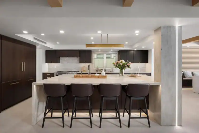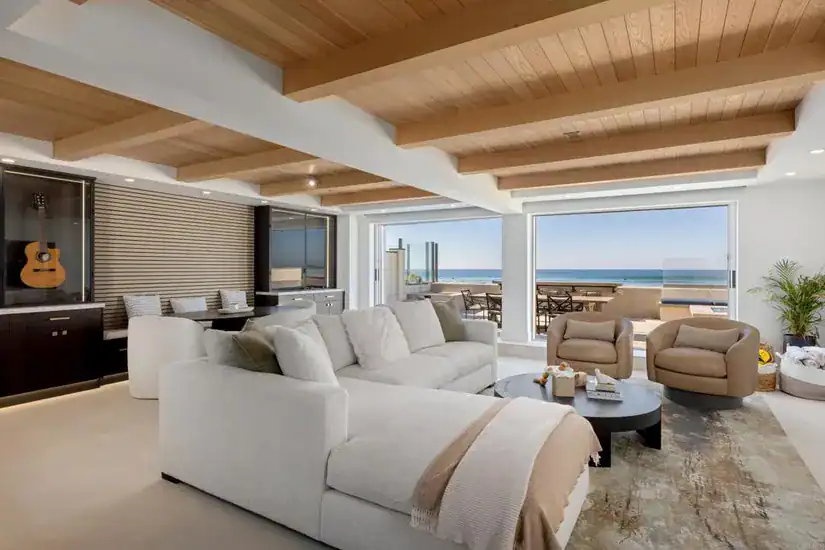Set across approximately 3,000 sq. ft. and positioned on expansive beach frontage, the residence blends open-concept living with panoramic, tide-to-sunset coastal views. Walls of glass disappear to create one seamless indoor-outdoor experience, where ocean breezes and the sound of waves become part of everyday life.